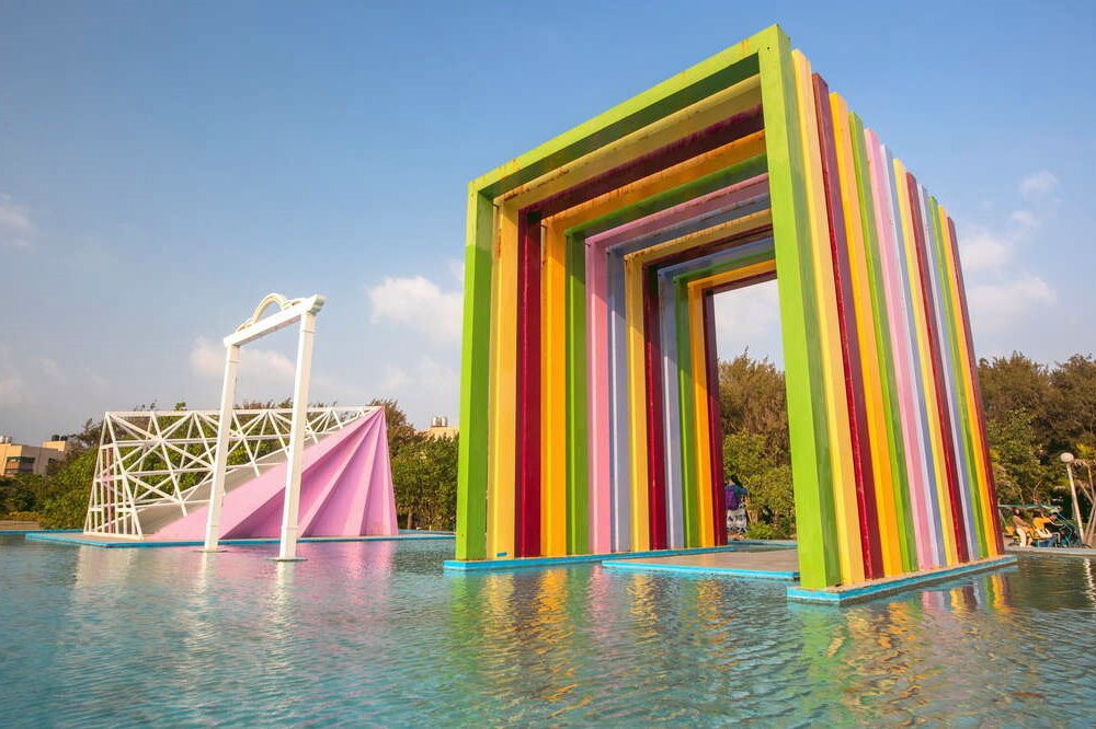 以幾何的建築形態為主要設計元素,搭配不同時間光影變化產生立體的空間感,彩虹色系則代表幸福意涵,為新人帶來好運祝福;另外彩虹教堂特別選在旗津沙灘場域,配合真實的海景,形成天然地景為概念,一旁的水池透過拍攝角度呈現無邊境視覺效果,讓建築體像是飄浮在海中央,塑造還天一色的婚紗美境,讓旗津遊客不必遠渡重洋也能拍出浪漫的異國風情!不只成為高雄旗津熱門及打卡亮點,更榮獲2015雅虎10全台大爆紅景點第二名。